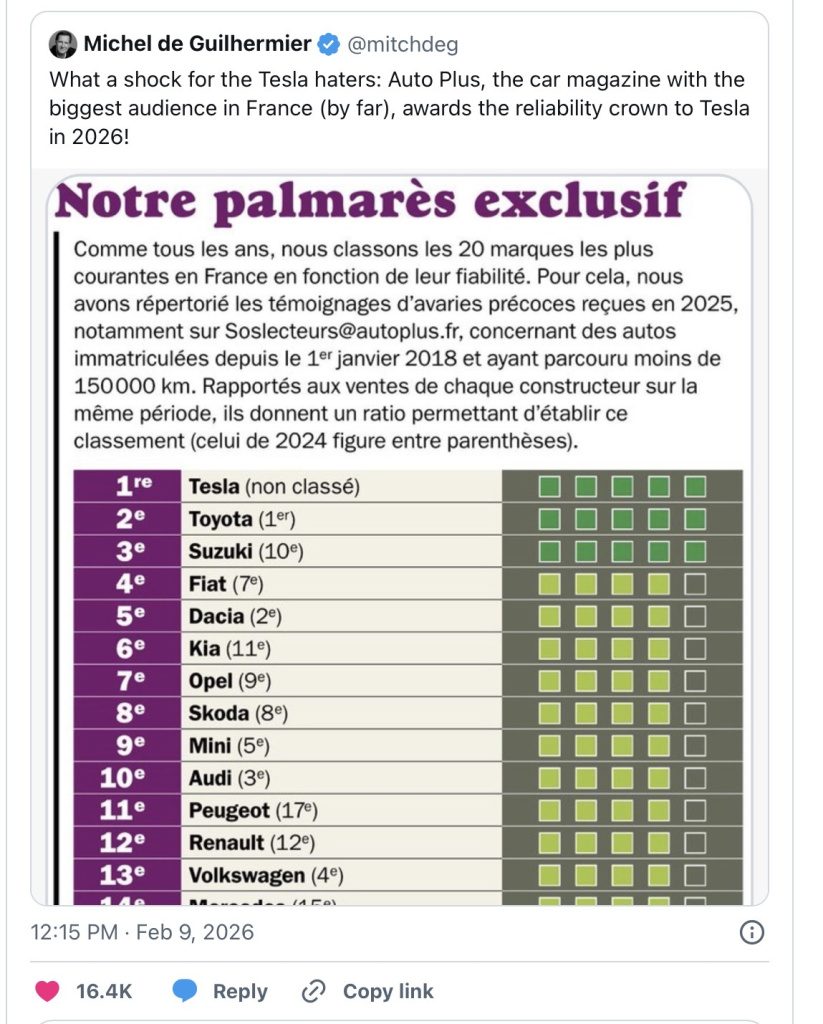 There’s a few that won’t like this but Tesla just tippytopped the French reliability ratings.