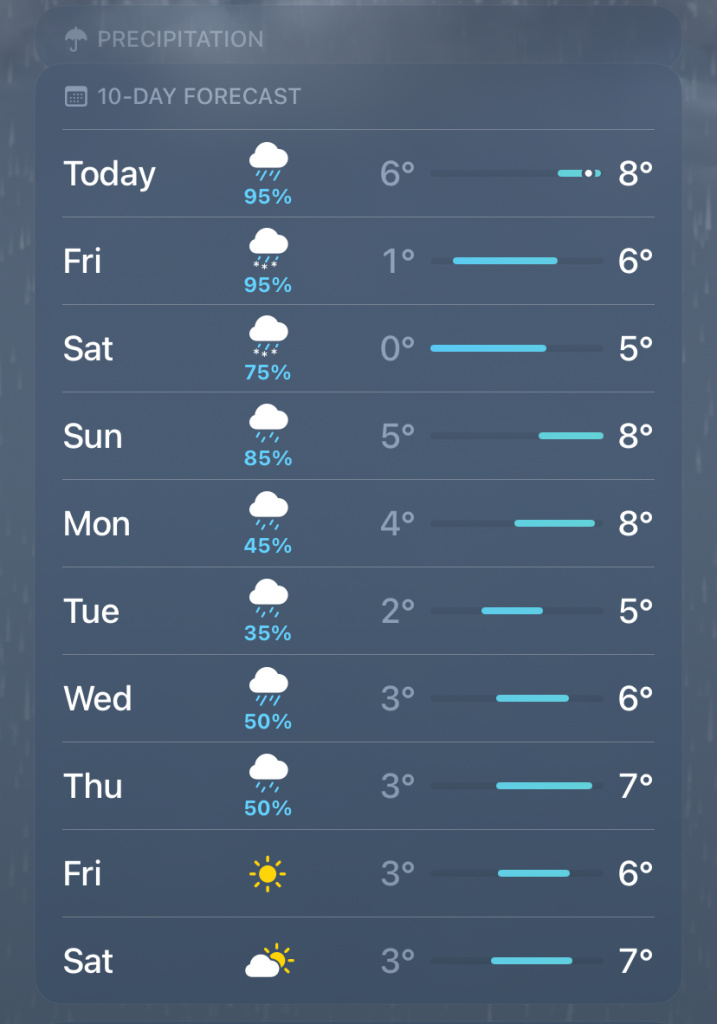 A cool day. Persistent rain, a bit of sleet mixed in on a higher route I just drove through.