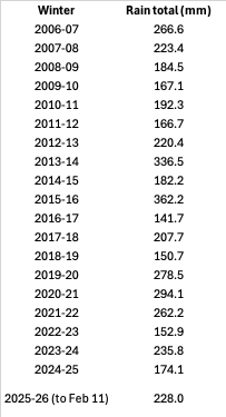 This is Dunsany's rainfall totals for every winter (DJF) since records began at the automated station.