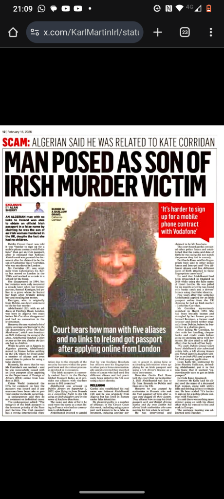Algerian fella in the UK scams an Irish passport. His solicitor says it was unbelievably easy to scam one and it's more difficult to get a contract with Vodafone! Inspiring stuff.
