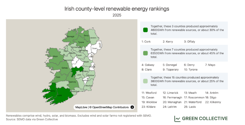 Meath is in the bottom tier of counties for renewable power generation. Along with Kildare and Wicklow, the 3 counties surrounding Dublin