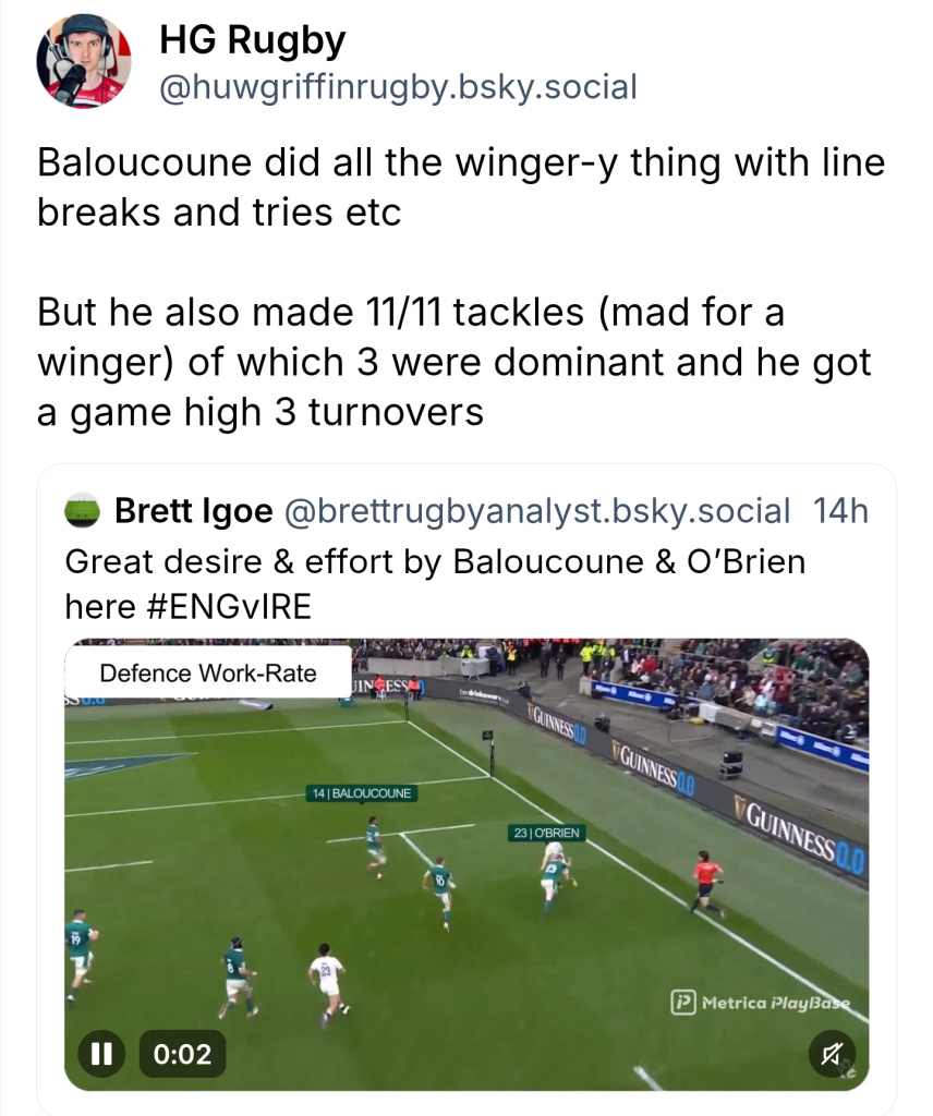 Looking at those match stats for Baloucoune is an example of stats backing up what we saw with our own eyes. 11 tackles, none missed, 6 carries. I posted here before that I didn’t think he got himself involved in the play enough in previous caps, well that wasn’t an issue yesterday. Great stuff.