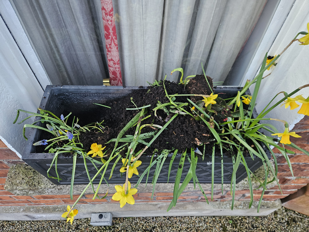 I think the weekly destruction of my window boxes is probably birds. And maybe the ones that are now being dug up that are on the ground. Why they're doing it, I have no idea - they dig all the way to the bottom (and those boxes are about 8 in inches deep) usually in one corner, firing entire plants and bulbs all over the place, but don't seem to bury anything and those boxes were planted with new compost in the autumn so they're hardly rich with worms and grubs.
