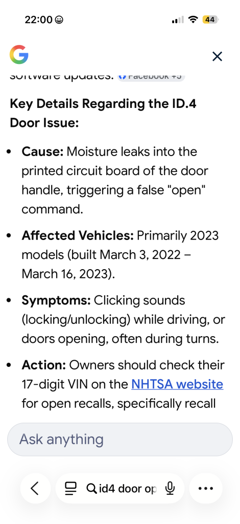 i did say ben told for a reason. VW in Wicklow did tell em there was a recall on my 2023 ID4 City. where they needed to put sealant around the parts of the to stop water ingress in to the electrics of the handle.