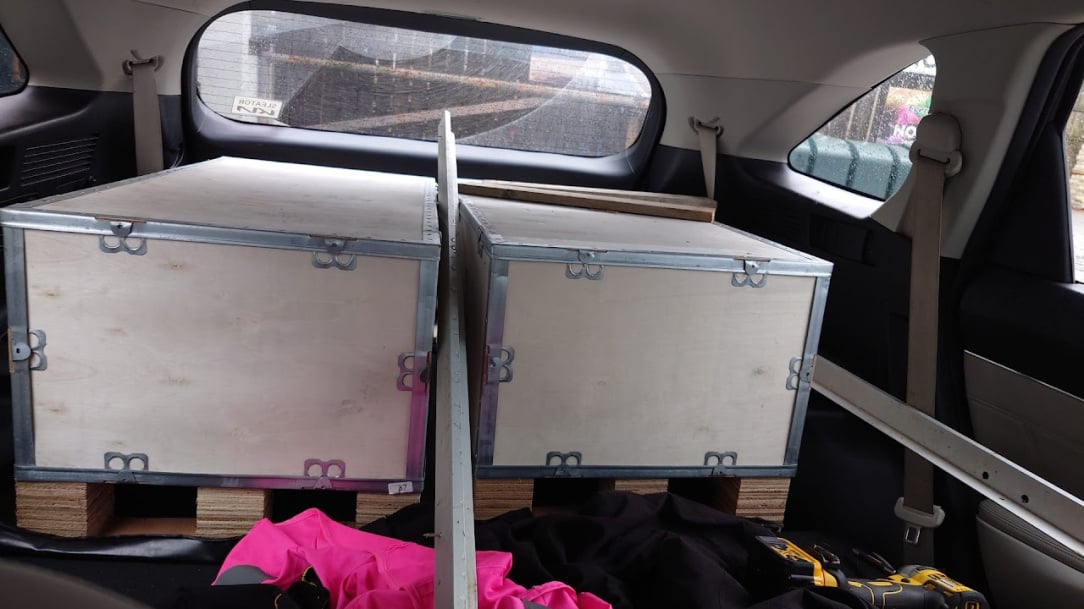 No one to drive the fork lift at the time, but two of us were able to separate the crates, and manhandle each into the back of a Sorrento 7 seater. We're both strong enough, there’s no lip on the boot and I had a little trolley to help slide it in, but I'd recommend having more man power if you're doing it that way!