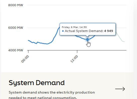 This afternoon's demand dropped under 5GW and within 400MW of the overnight low last night.