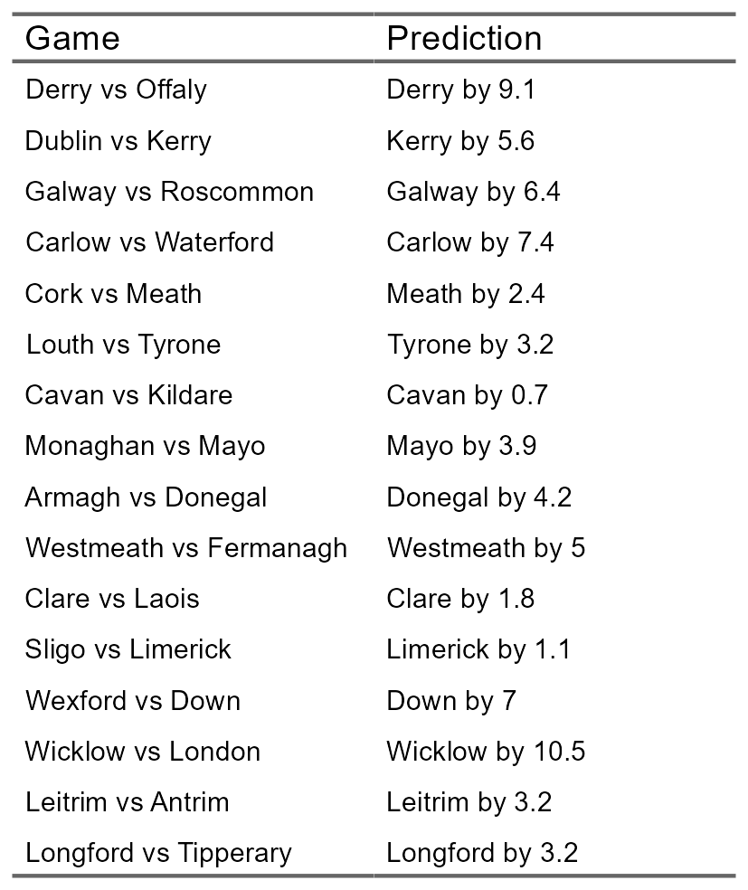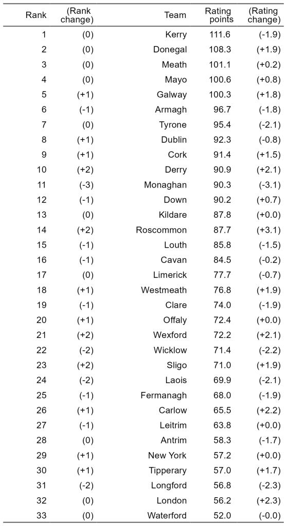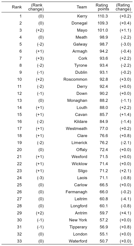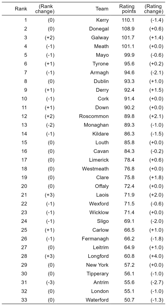Ranking table update after round 3 of the league - the only minor upset was Roscommon beating Armagh. Rating points were exchanged in 13 of the 16 games played, which generally happens during the league where teams are at relatively similar levels.