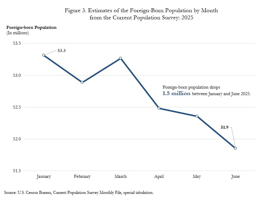 "In January 2025, 53.3 million immigrants lived in the United States – the largest number ever recorded. In the ensuing months, however, more immigrants left the country or were deported than arrived"