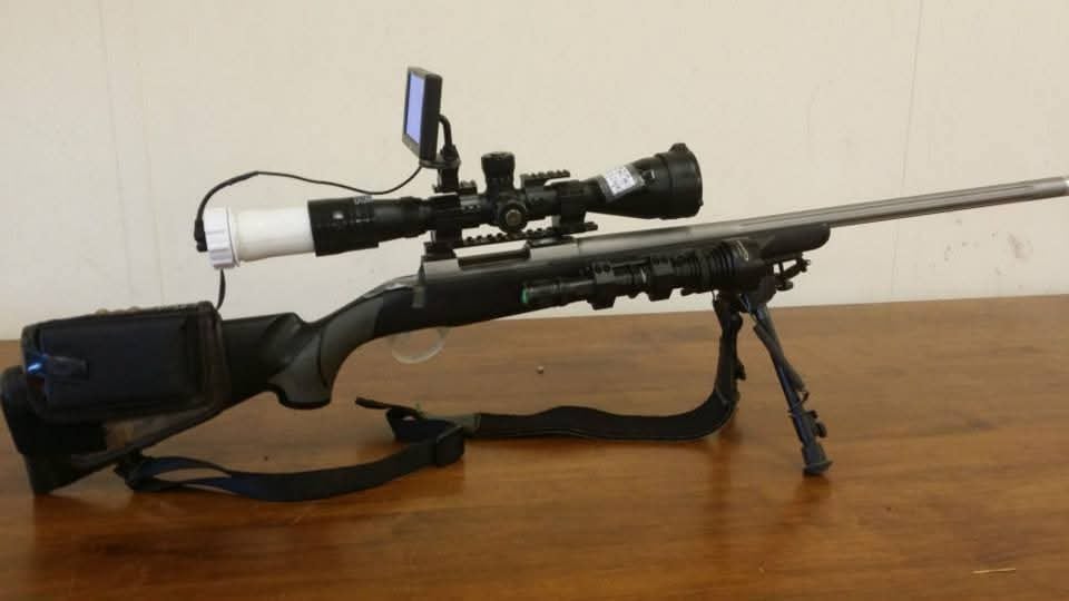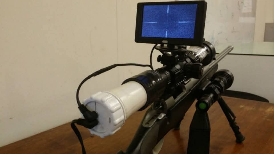 I started off with a decent enough DIY add on, rear mounted set up. Very small IR camera fixed in white waste pipe, pushed into silicone exhaust tubing, pushed onto the rear of my scope. 4" LED screen on top, with small 12volt battery pack on the stock. Used with a good IR torch fixed to side front of the stock. It worked well but had to look at the screen to take a shot. I think I still have a camera here. 🤔