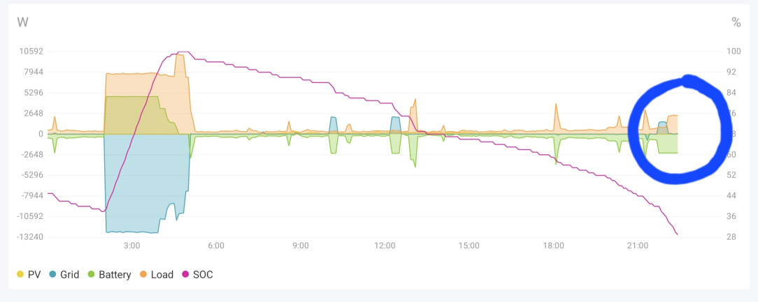 Hoping someone can help. My setup is Solis 5kW hybrid inverter, 3 Weco 5.3kWh batteries, 15 Aiko Neostar all black panels. I'm with pinergy and fill the batteries in the 2.00 a.m. To 5.00 a.m. window. No issues with that. Now the days are getting longer I've spare capacity I was planning to discharge before 2.00 a.m. The issue I'm having is inconsistent. Sometimes the discharge works fine. Discharges at a rate of 2.5kw with 2.2kw or so going to the grid the rest is house load. Sometimes the load will ramp. Up to the full 2.5kw to match the battery discharge and zero export. There's nothing in the house drawing this. So it must be the inverter. It matches on the Solis crowd and when I check the export logs on esb networks. Anyone know what might be happening. Could it be the CT clamp?