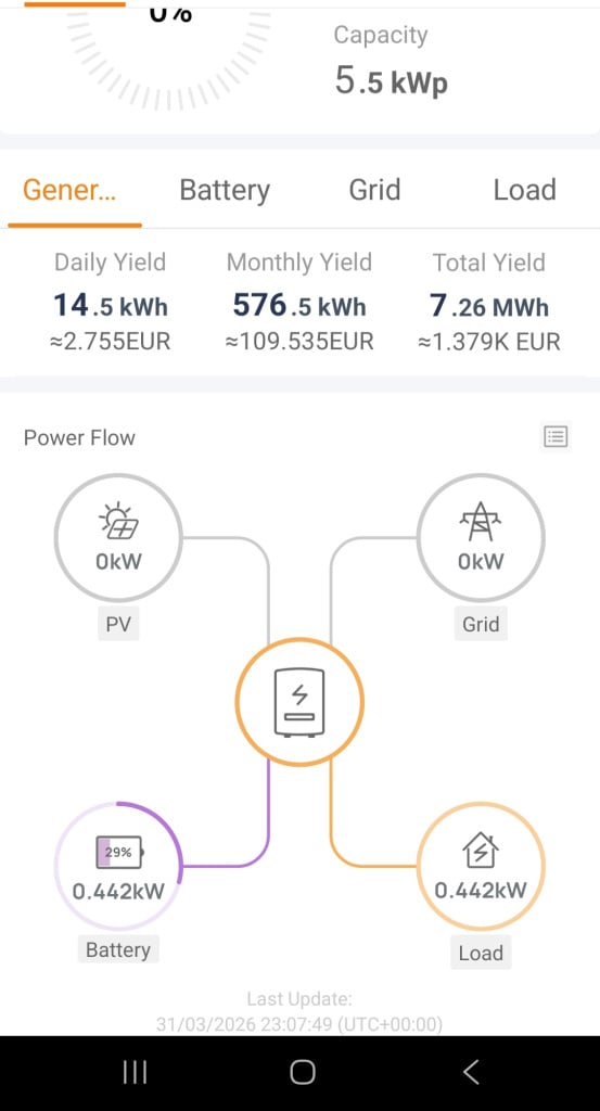 Since initial installation on March 7 2023, a total of 23.52MWh generated, 16.17MWh fed to grid, with a self-use ratio of approximately 31%.