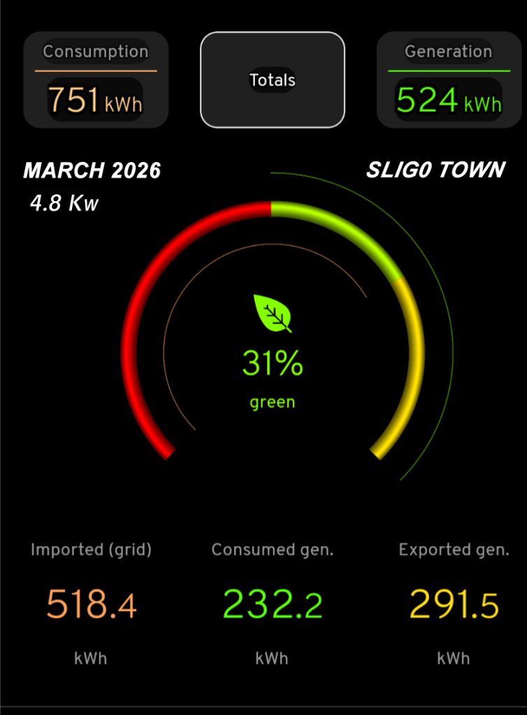 A terrible month for solar in coastal Louth : 219kWh from a 9kWp E/W split which compares poorly with 277 in 2025 and even worse compared to 329kWh generated in 2024.