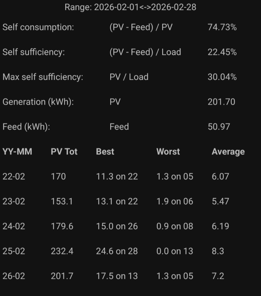 In February, self-used 44% of electricity generated and fed in the other 107kWh (no battery).