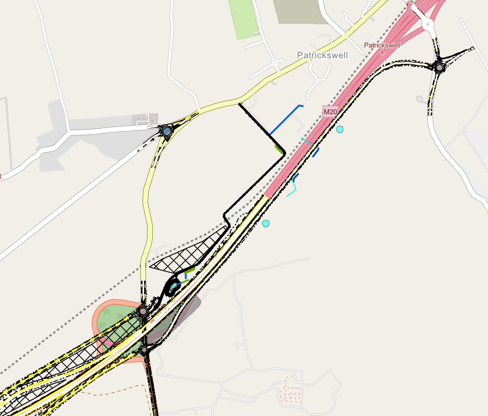 Updated interactive map indicating a new road to be built parallel to the M20 to the south to prevent traffic travelling through Patrickswell to access the Attyflynn road.