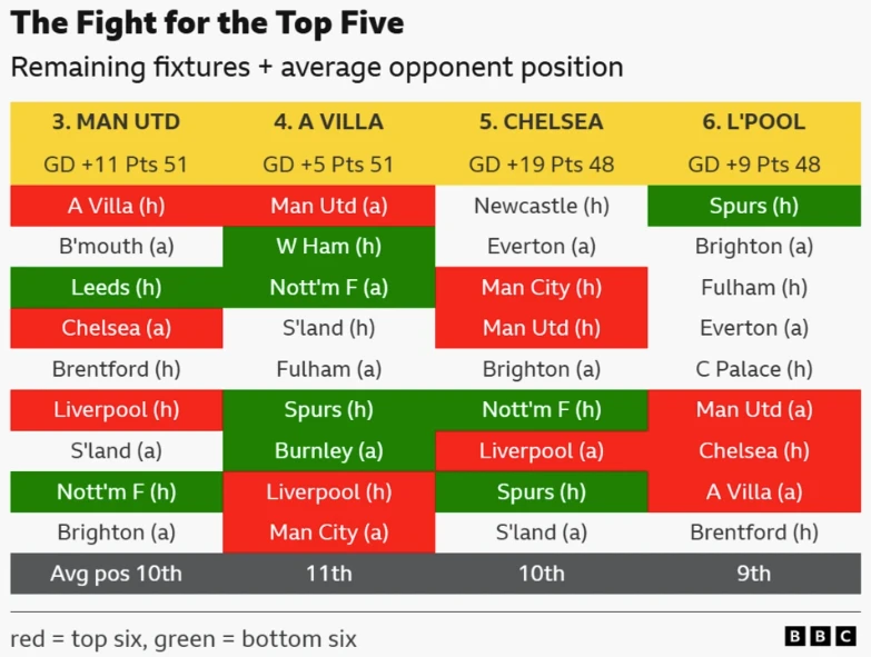 That's a tough final 4 games for us and away to Everton too. I see possibilities for dropping lots of points there. Villa have it worse though.