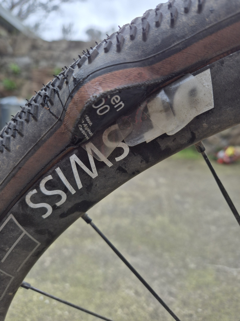Coming down the hill at Firhouse with the wind at my back for a change felt a wobble and heard an almighty bang. New rear Schwalbe G-One R Pro Super Race ripped at the seam leading to a blowout. Didn't really have anything I could use as a tyre boot and then remembered someone on here using a crisp packet. Found a gel wrapper which I folded double and tried that. Managed to kill one tube in the process of replacing the tyre but just about made it home on the second with minimal pressure, keeping all my weight on my feet and speed down. Will add a proper tyre boot to the saddle bag next time (wrappers don't really do the job, see below at end of the journey!) and won't be using this model of tyre ever again. Looks very much like a manufacturing fault and a dangerous one at that, I'll be getting on to Schwalbe.