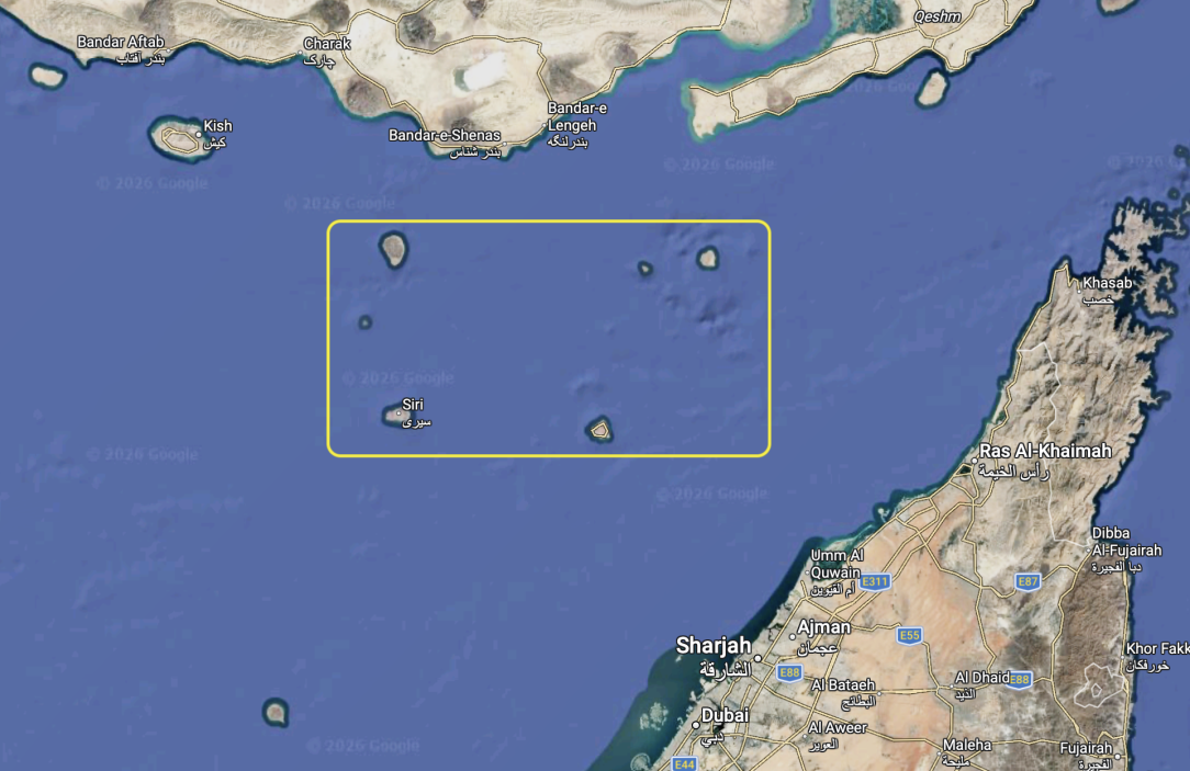 Above is a Google Maps screenshot of the western part of the Strait of Hormuz, with the UAE visible in the bottom right, and the Iranian mainland and the island of Qeshm at the top. There's a loose grouping of six islands in this area that form a "gauntlet" that shipping in the Gulf have to pass through in order to transit the Strait. I've marked them in yellow.