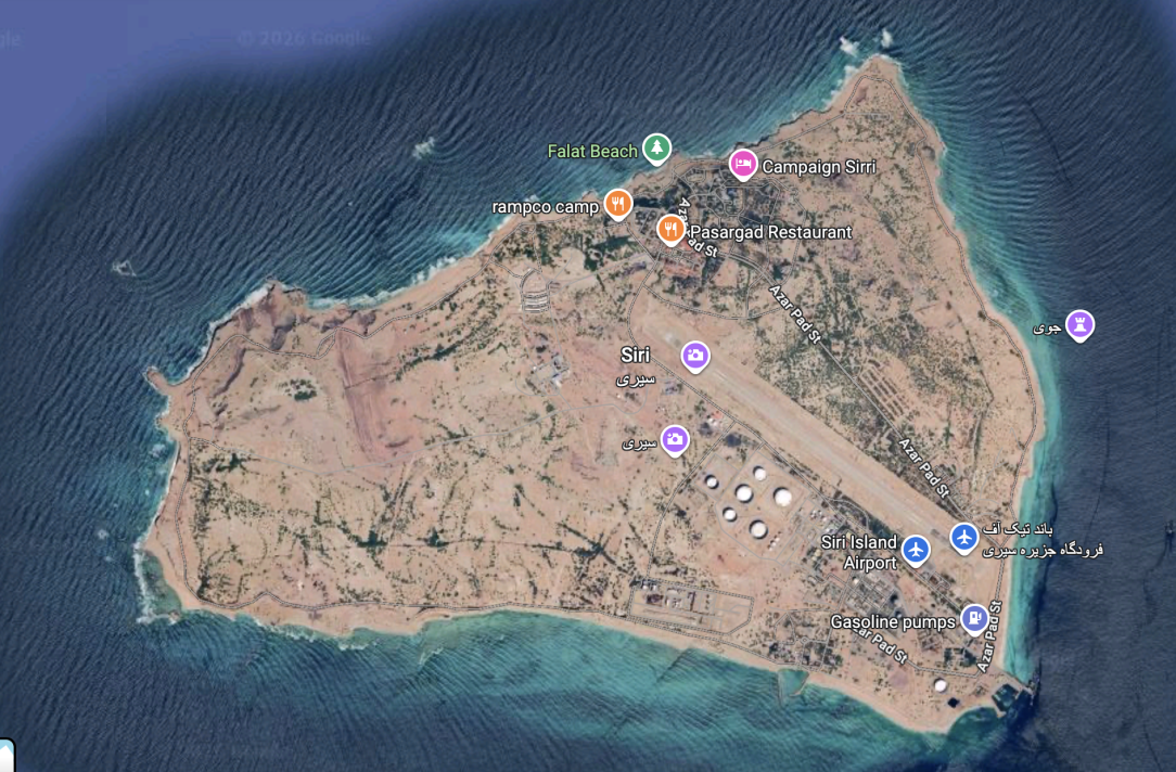 Sirri Island is probably the most crucial island in the group, since it is the site of a sizeable oil terminal but otherwise unpopulated, with the only civilian infrastructure being related to worker's accommodation for people working in the oil terminal. The oil tanks of the terminal are clearly visible in the Google Maps screenshot above, as are the islands two harbours on the south.