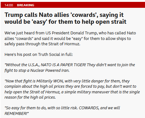 The orange buffoon is still posting on social media that the war is won yet others won't open the straits….
