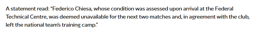 9am Monday morning….Chiesa has already left the Italy camp with an injury.