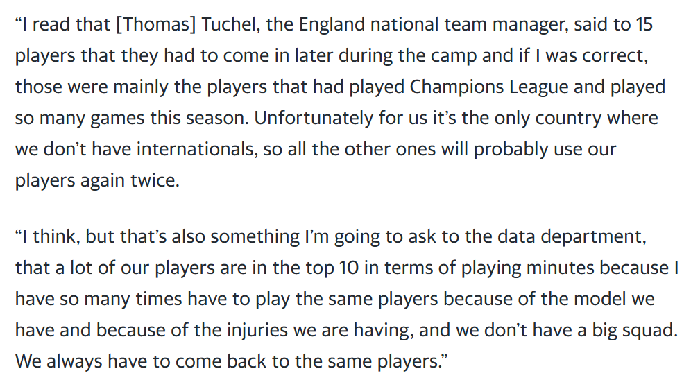 More quotes from Slot about minutes, I've not got much sympathy considering there have been dozens of opportunities to rest players and give much needed minutes to others this season and he just doesn't do it.