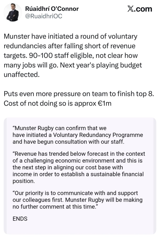 Edit: just read Munster arrived on Wednesday (planned on Tuesday) after being able to go home and sleep in their own beds before departing. There's no way this can be an excuse for the performance we saw on Saturday.