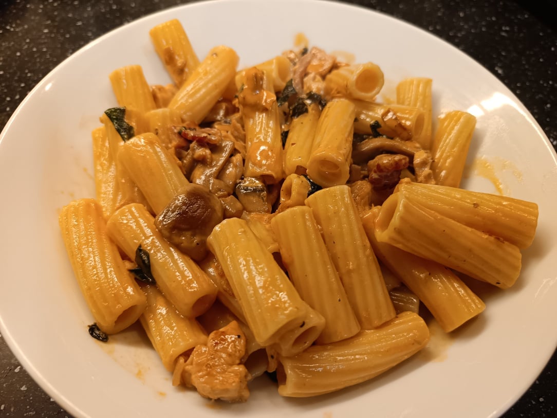 In a hurry this evening, so rigatoni with chicken, smoked bacon lardons, mushrooms and a sauce made with tomato paste and cream. Speedy but very tasty.