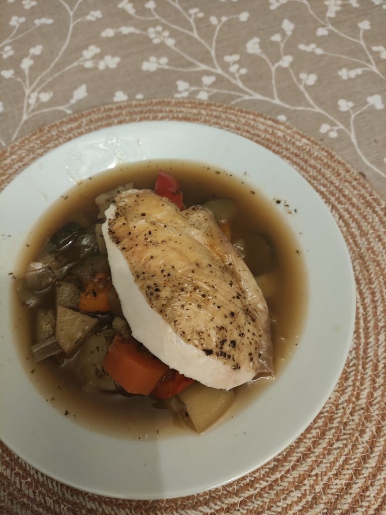 Last nights, chicken breast on chunky mixed veg broth.