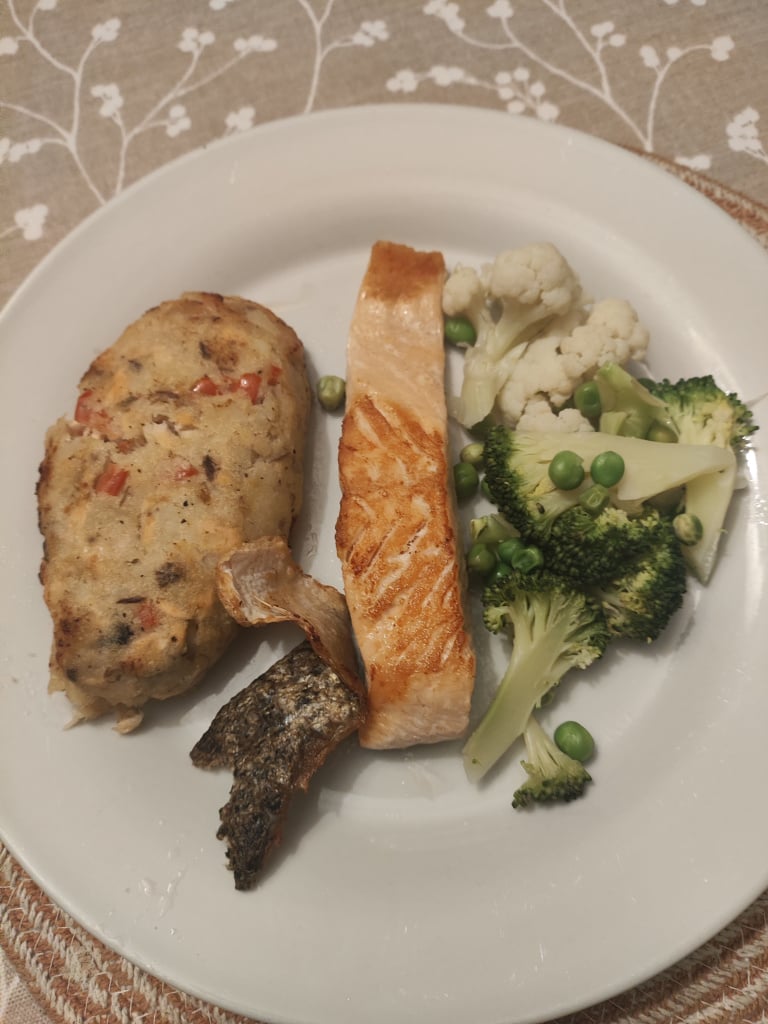 Salmon, mackeral and salmon fishcake, steamed veg and airfried salmon skin.