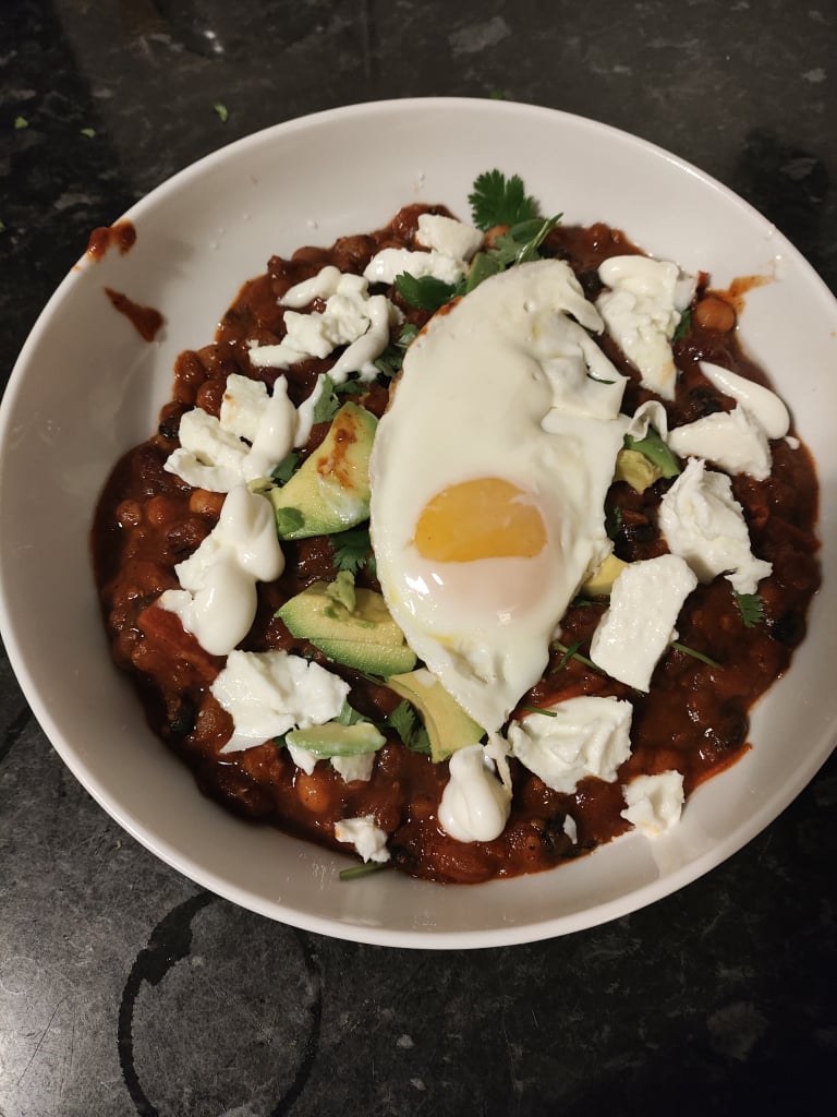 Bean stew with avacado, mozzarella, coriander, fried egg.