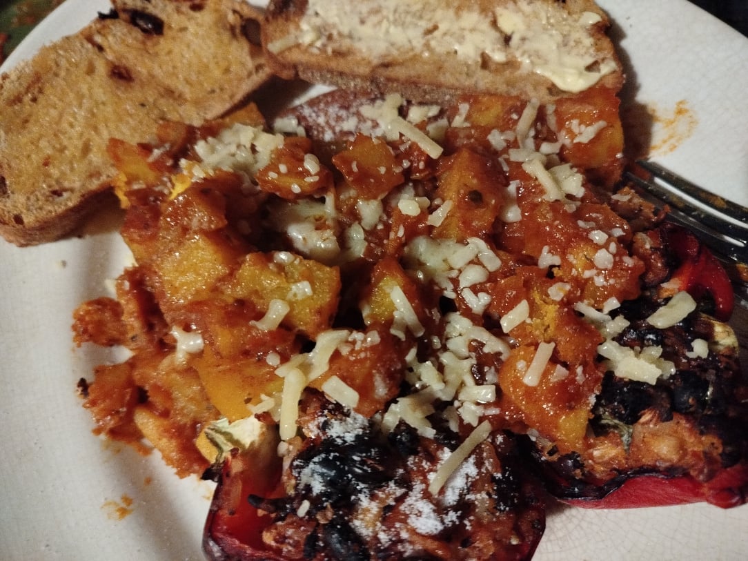 Stuffed peppers, Onion Bhaji, Bombay Aloo topped with grated cheese.
