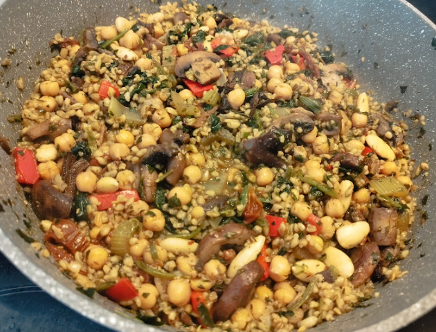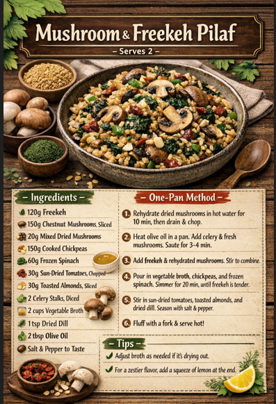 Mushroom & Freekeh Pilaf with Chickpeas, Almonds, Sun-Dried Tomatoes & Spinach.