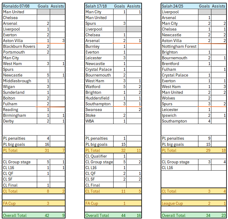 It's mental to say that Salah never beat Ronaldo's best individual season (at Man Utd) when he literally did score more goals and got more assists. When comparing 2 forwards, the only thing that you can use to factually compare the 2 is output -goals and assists. Pressure, influence, presence, fear-factor etc are all things can we can't measure, and nearly 20 years later it can't be looked upon with varying degrees of over/under estimation. Just to compare the Ronaldo season vs Salah seasons (I personally think that his 24/25 season is a better overall season, even if the total goal contributions is lower).