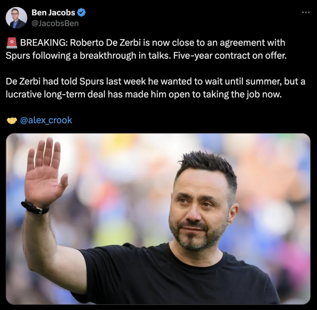 Looks like it will be be De Zerbi. Bad choice imo, and that's regardless of his stance on Greenwood. Don't see any way that he'll turn things around, and don't imagine he'll lift the players up much. Plus he'll end up falling out with the board within a year or two (assuming he lasts that long…big if).
