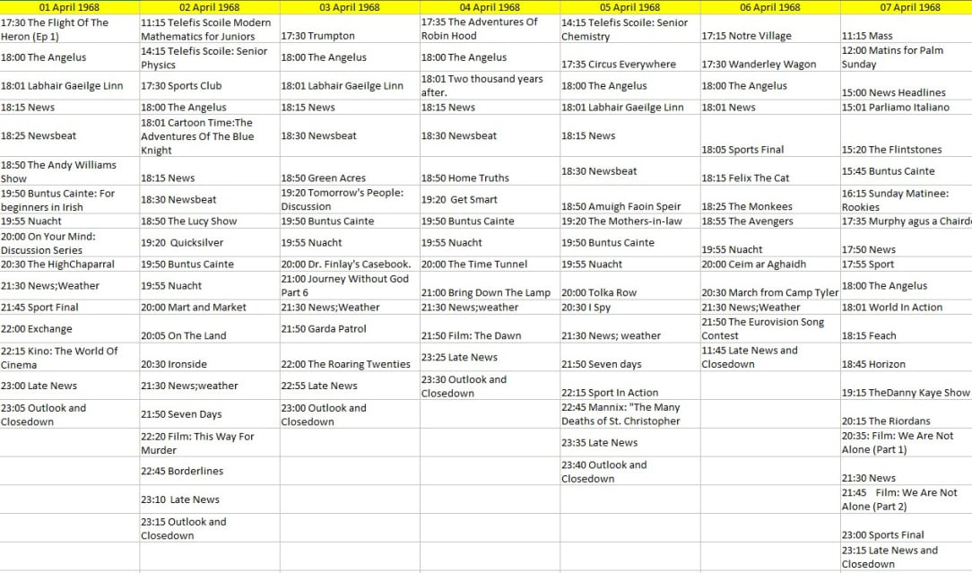 In fact, RTE's schedules with its weird mix of American imports, the odd British show and rural local programming, does resemble the schedules of CBC Nova Scotia https://www.kevinmccorrytv.ca/tvlist4.html