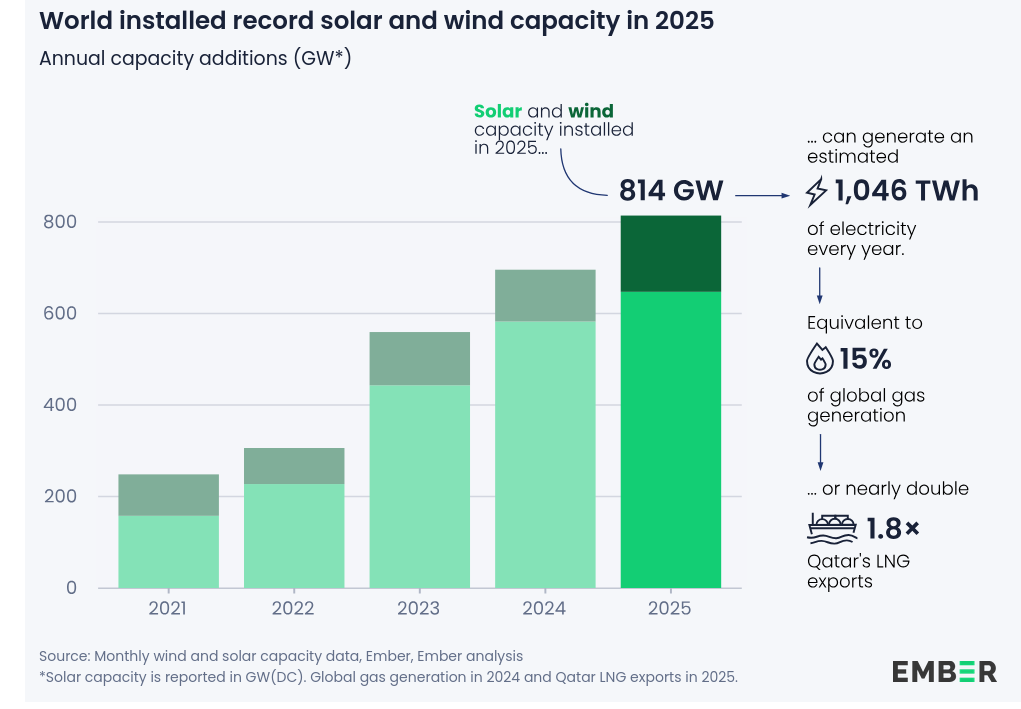 In the first three quarters of 2025, solar generation rose by 498 TWh (+31%) … Wind generation grew by 137 TWh (+7.6%).