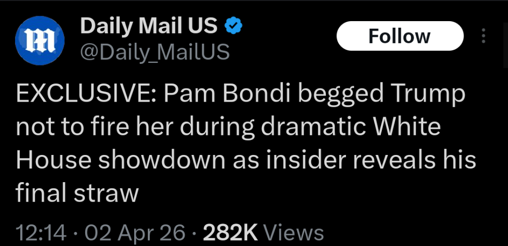 New reporting on MS NOW: Trump has told Pam Bondi she will soon be removed from her position.