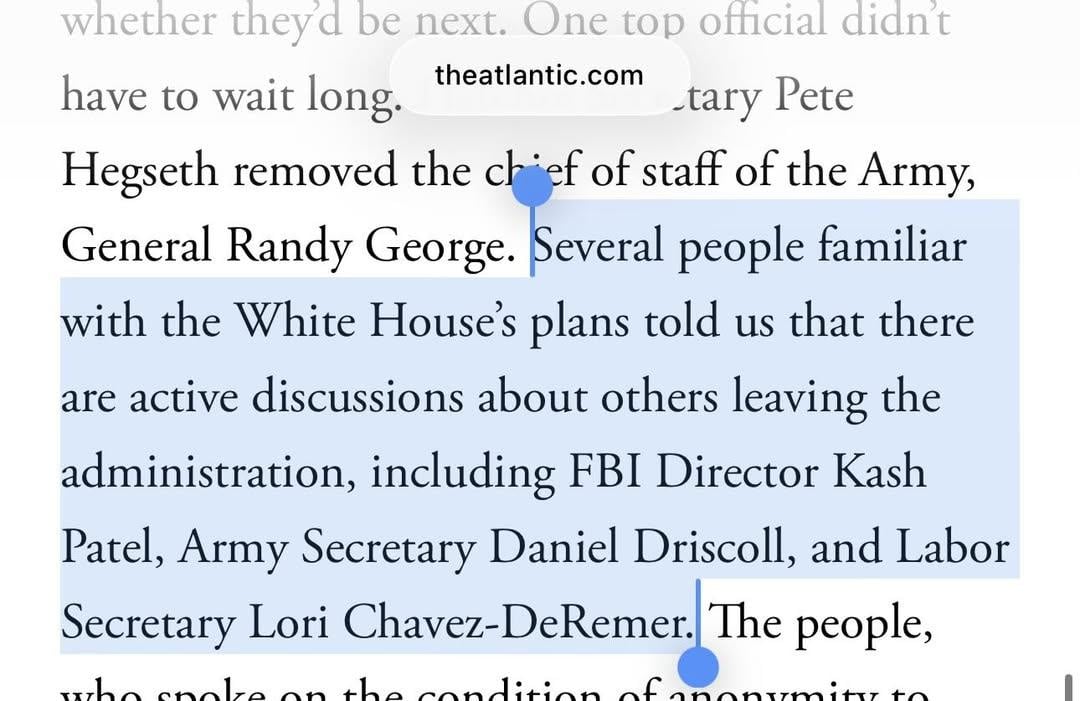 Has there been any leak as to whom it was who fired the Army COS; Trump or Hegseth? Seeing as the announcement was that the "retirement" was with immediate effect, no lead in to ensure the newcomer got a briefing on ongoing Ops, has Trump handed over total control of firings within his administration to his Dept secretaries?