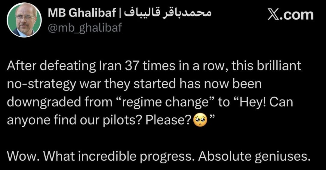Iranians seem to be having a good friday considering the US gained air superiority on the first day. Leader of the parliament seems to enjoying it.
