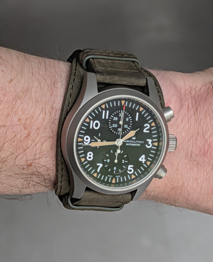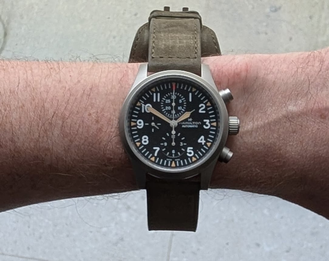 NWD Hamilton Field Chrono, bit of an impulse buy as I had a watch I bought as a present to exchange but really pleased I got it. Have wanted a mechanical Chrono for years. Love the dial and sandblasted case. Wasn't planning on buying anything this year so will have to sell some pieces now to justify having it. I got it at a very good price so well worth it I think. Something different to have and a nice change from my usual Seiko divers I'm tempted by.