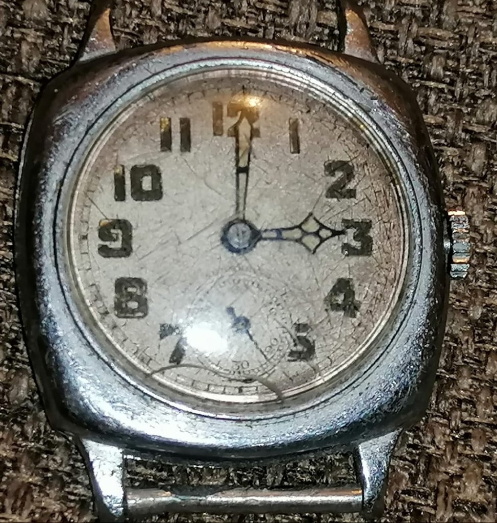 I'll take a guess now H_Lime and going by the colour say that the (may not be original)handset has been relumed with safe luminova type stuff, but the numerals are radium and still "hot"(1600 year half life). Handsets of this vintage tend to lose their lume faster as the original radium mixes were hotter and sucked in moisture more. The radiation blew the phosphorescent material in the mix out in a few years(WW1 ads guaranteed the lume for only 2-3 years)and as it broke down it got more delicate. It was also getting hit by damp on both sides. Numerals tended to last much longer.