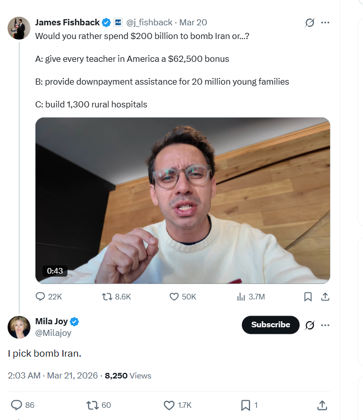 I struggle to understand how the vast majority have gone along with the Iran thing even though he was banging the 'America First' drum so loudly in his campaign. Maybe MAGA were always more ambivalent about foreign interventions, or it wasn't as big a priority for them as it seemed to the outside observer…
