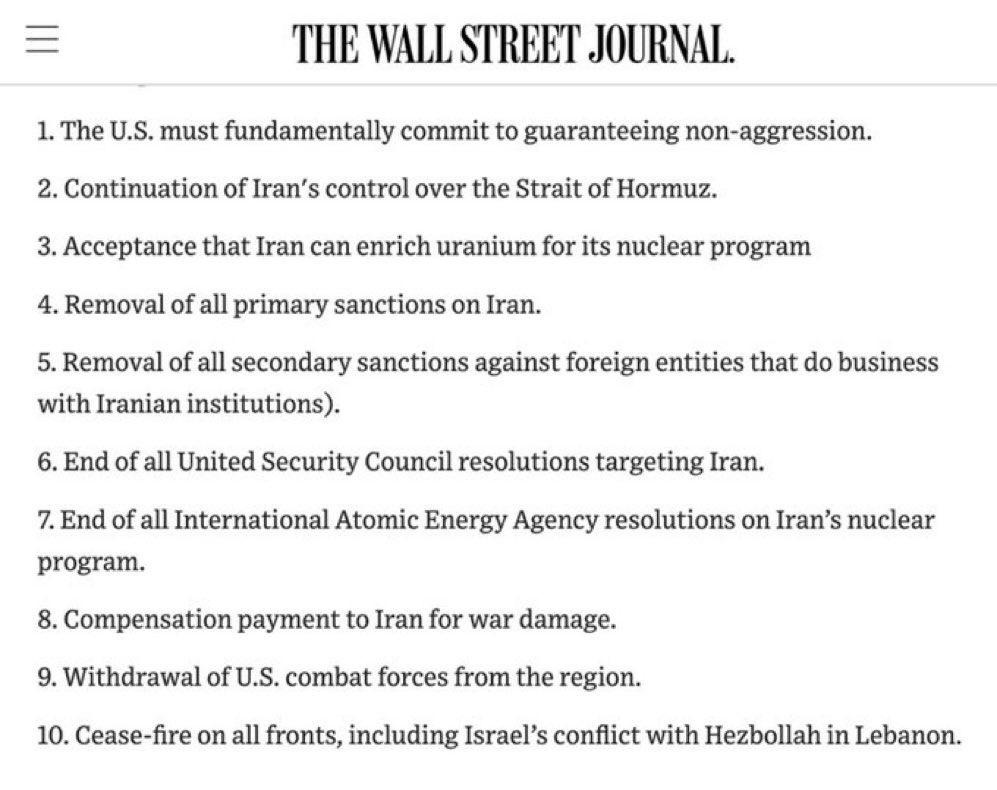 Is that really the Iranian 10 point ask? If so, it's a huge victory for them. They get everything they want. I am amazed Trump agreed to that as a basis for negotiation. It's a humiliation. The US military are humiliated too.