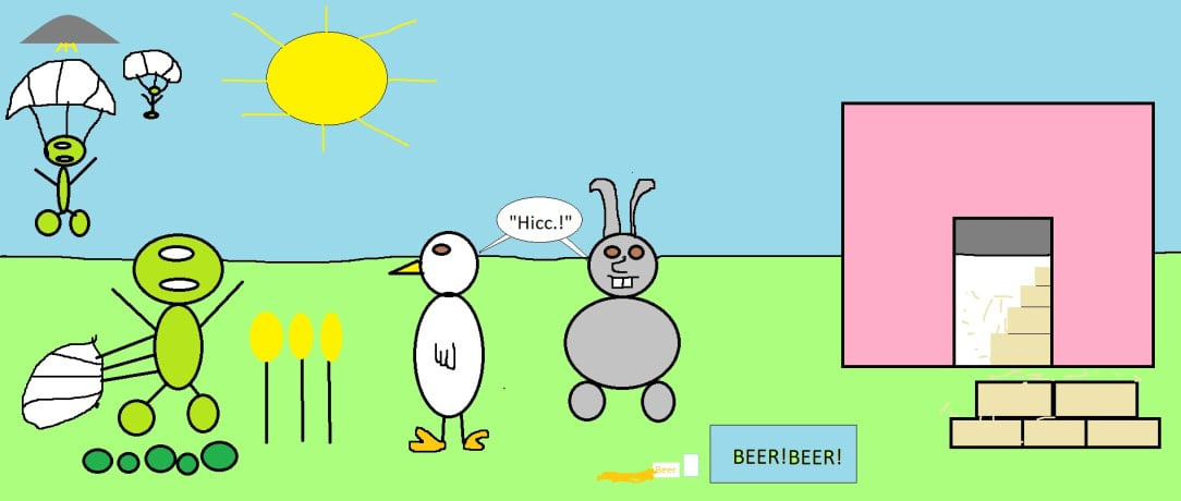 Stunned Alien is totally malt-ivated (don’t worry, beer happy) after  discarding the parachute.  Jay0 takes the bunny off the farm and offers him a species change operation (no judgment) to Pigly Footballer, who brews it like Beckham. score: Sun 0, Son 7.  Duck  cheers (Ale yeah!)  and stays hydrated sipping pretty on  the safety steps.