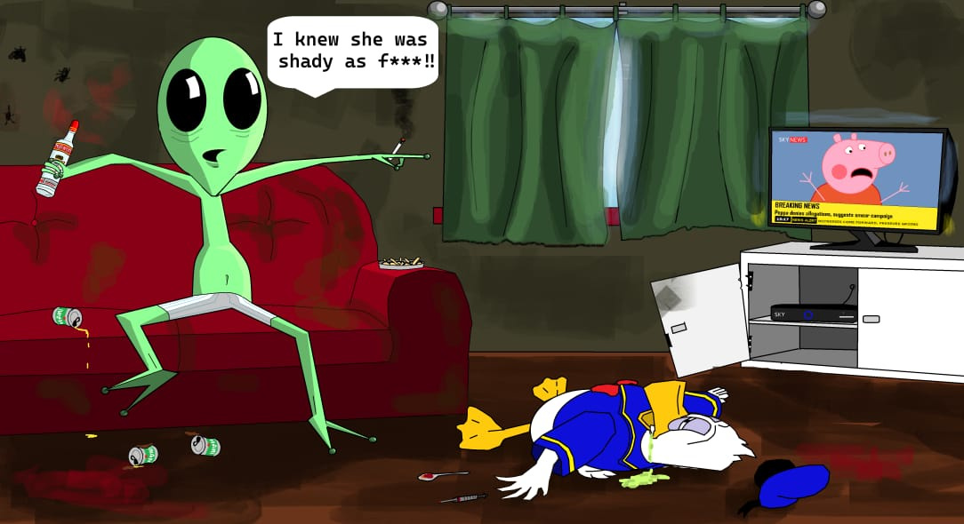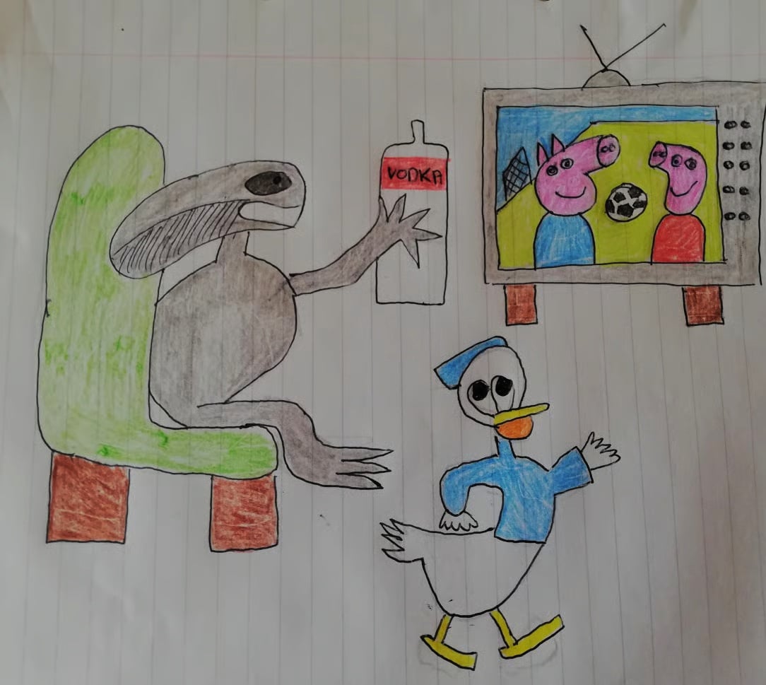 "Vodka drinking alien, watching Peppa on TV, with Donald Duck."