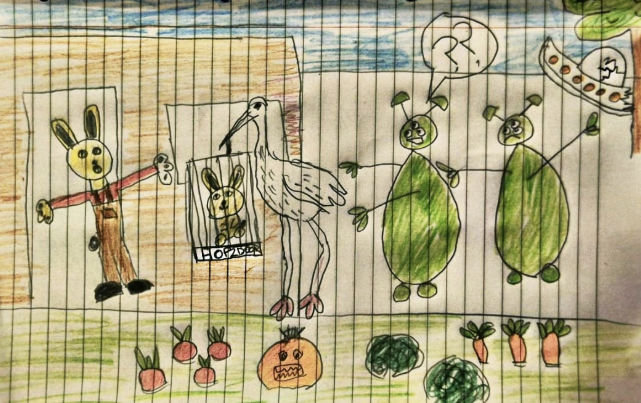 Farmer bunny shocked with news of Storks Hop2Door caged newborn  delivery service.  And those fat aliens, who ate all our Easter chocolate, finally present themselves… and  are about to nab storkmons tail feathers, and whisker away for alien inquiry (tail me more). Lettuce see that pumpkin has a fright. Carrots all around.