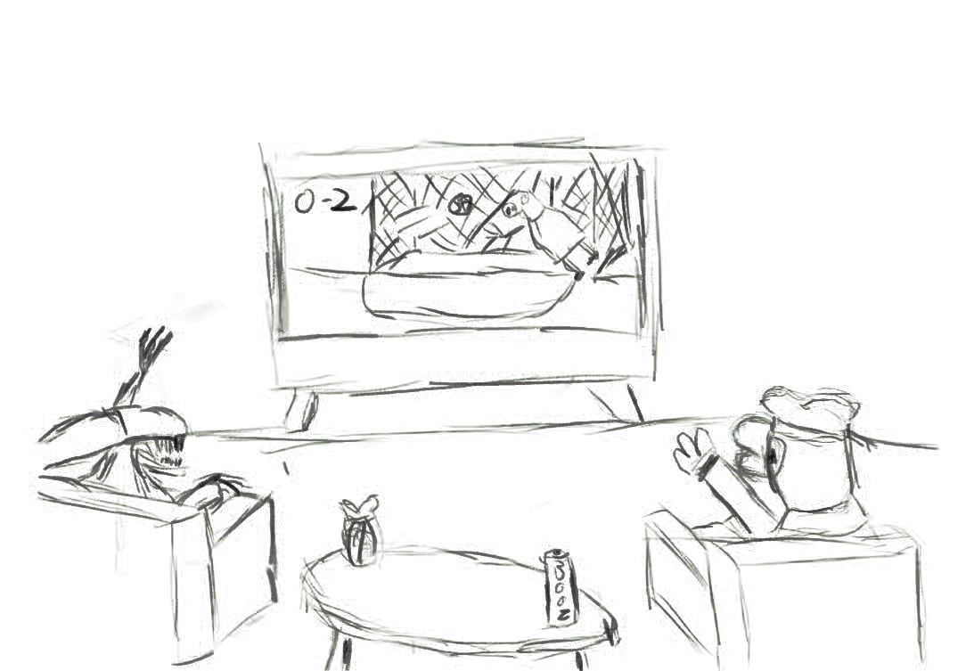 Our newest painter, thomil gives  daves description  (Alien and Drunk Donald Duck watch Peppa Pig play football) an extra kick with his pencil perspective of matchday brewskies with the animal/alien crew: