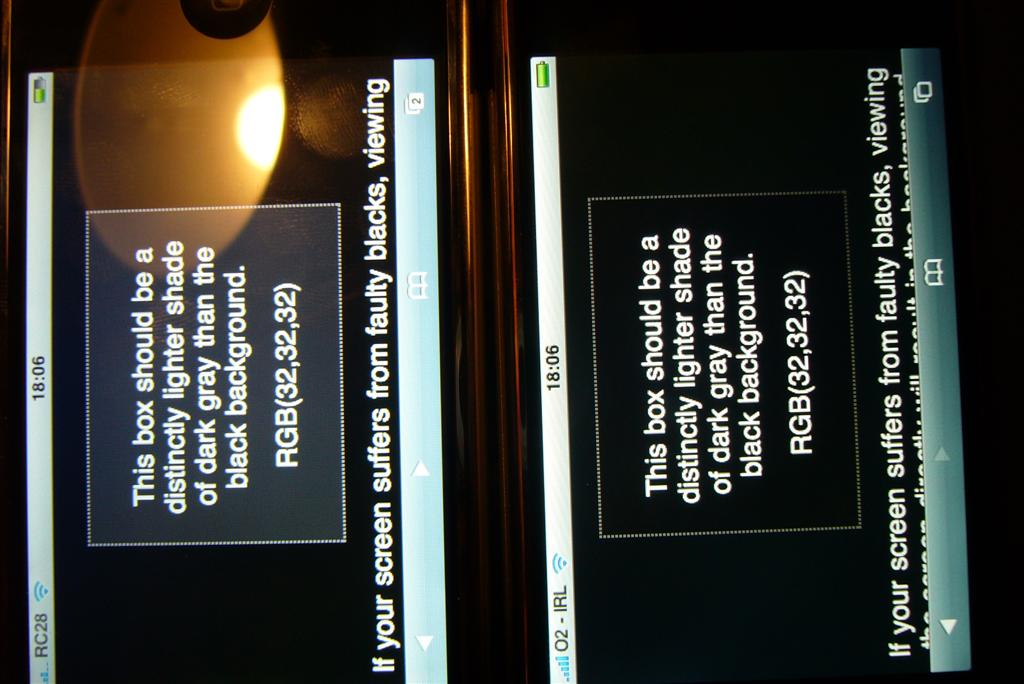 Overall, the screen just appears darker than mine, even at highest brightness settings, and if the screen is displaying certain black/dark colours it gives a weird "negative" effect. I took a few pics. The iphone with "RC28" up in the top left corner instead of vodafone is mine. The o2 iphone is the one with the bad screen;