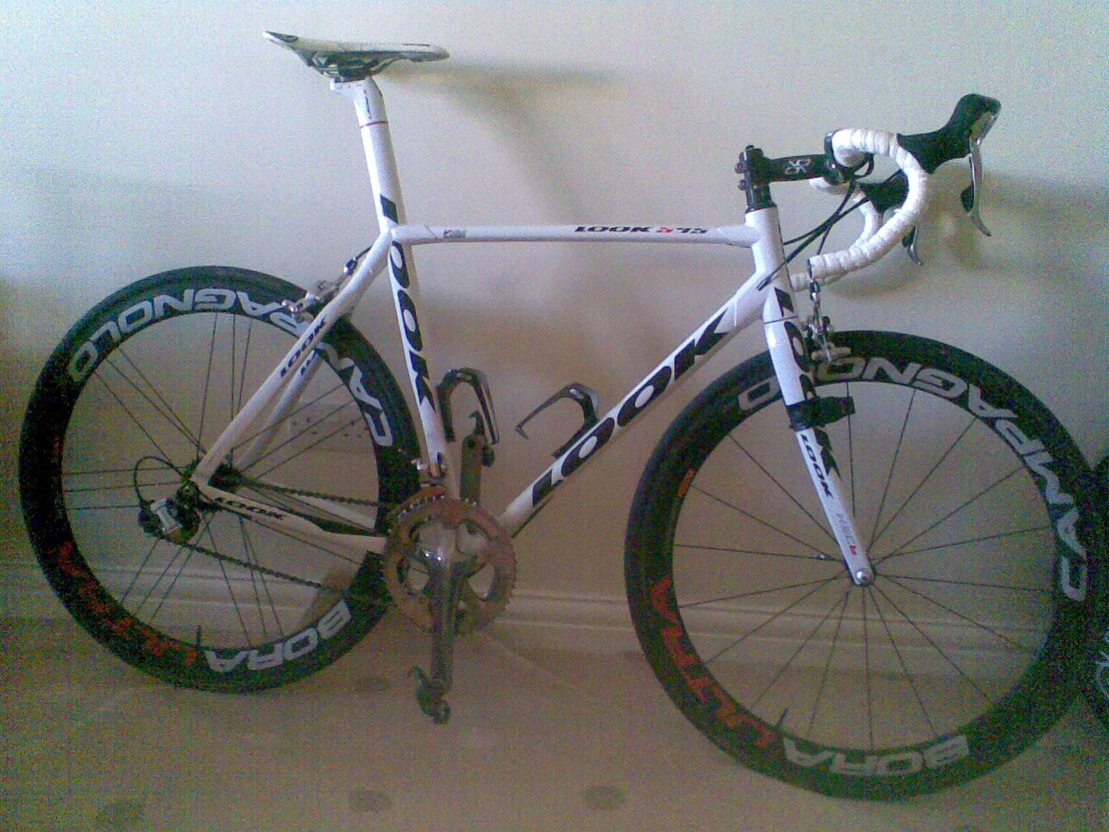 Those are tubular Corima's, a set of the older yet lighter Medium model which are between 1350-1400g for the set. I just modified them a little with the fancy stickers to make them look a bit more modern. The rear tyre is a Continental Sprinter (275-280g) which has lasted around 1,500kms of racing puncture free. The front is a Continental Competition 265g which I just put on recently (wouldn't usually run these as they are €60 each but I got them half price on WeightWeenies for sale section). Previous to these I went through 3 Vittoria Corsa Evo CX II 320TPI - light at 245g - in the space of three months, ridiculously bad puncture protection or just seriously unlucky.