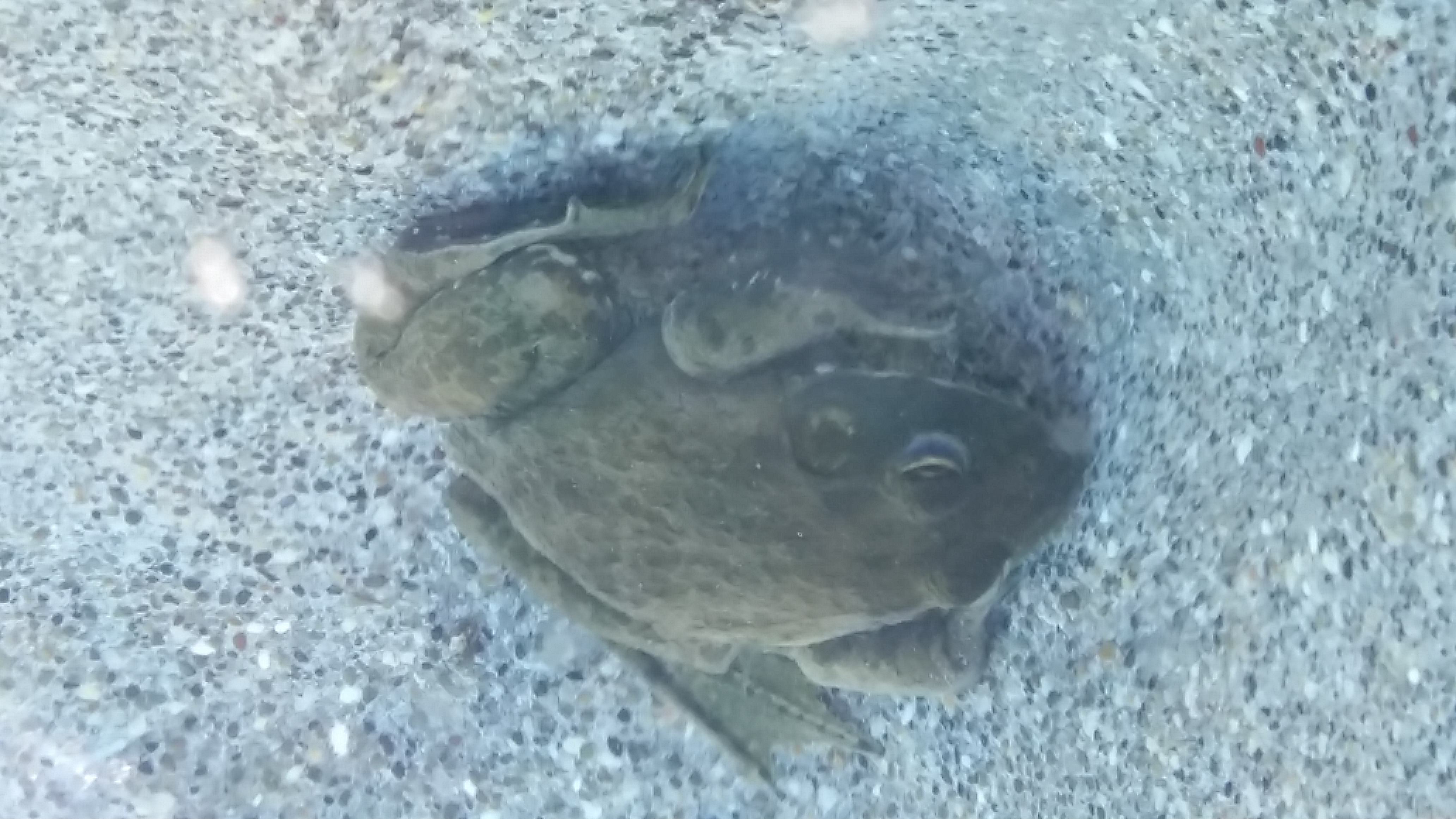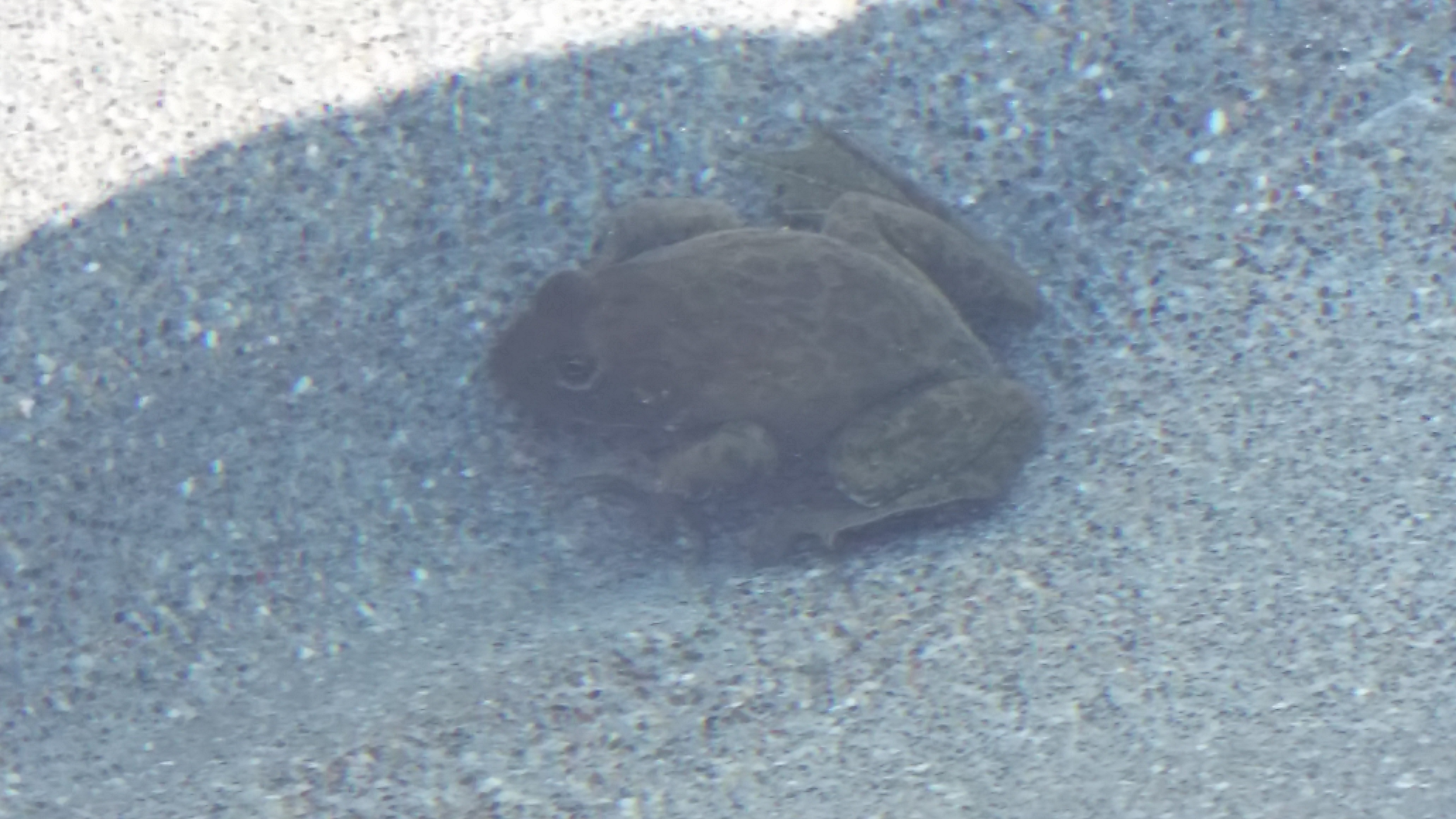 Frog update: After not seeing him in his drain I had a feeling he was in the pool...and yep, there he was, stuck in one of the scuppers. Scooped him out and placed him in the grass. :)